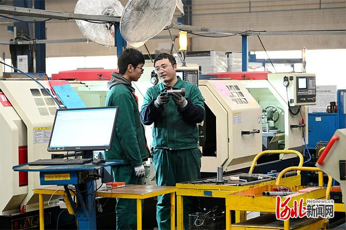 “车间就是我的课堂”。1月15日,安平县河北骄阳焊工有限公司机械加工车间里,衡水职业技术学院安平学院学生王恒达俯身调整着数控设备的参数。他说,理论在学校学,实操在生产线上练。半年多来,他把这些“铁家伙”的脾气摸得门儿清。相邻的组装车间里,他的同学于浩博正在工人师傅指导下组装一台焊网设备。