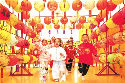 1月28日,在安徽省合肥市长江路幼儿园教育集团总园,小朋友们手提手工灯笼开心奔跑。赵明 摄