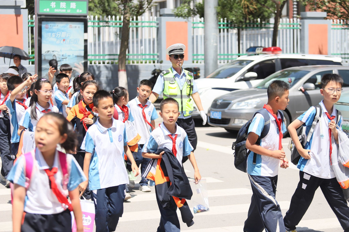 2025年7月9日,甘肃省平凉市公安局崆峒分局交巡警大队的民警在平凉广成学校门前引导小学生过马路。图源 IC