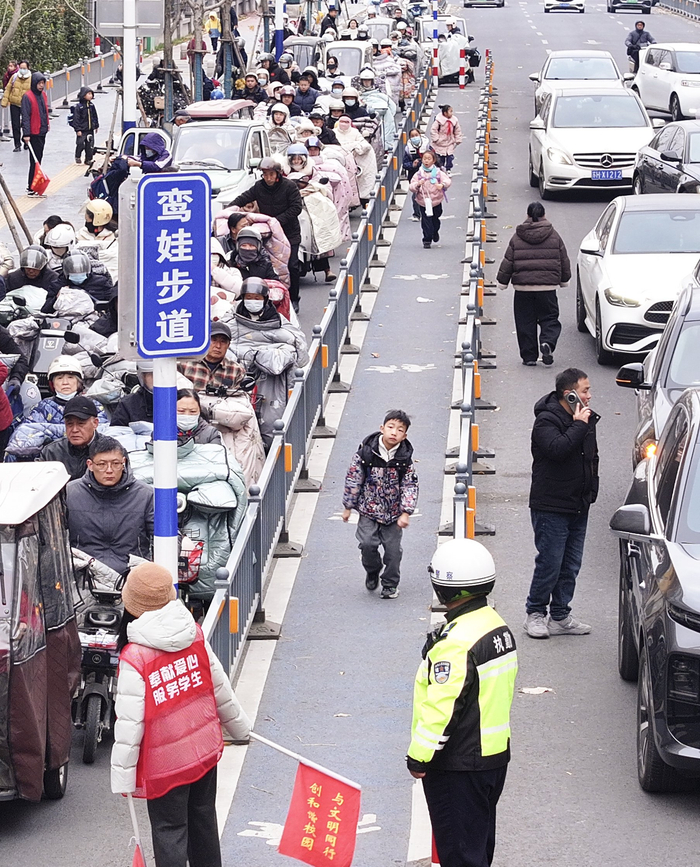 2025年12月12日,江苏省淮安市交警和家长护送小学生安全入校。图源 IC