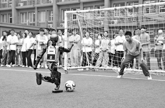 在日坛中学操场上,人形智能机器人与学生一起踢足球。本报记者 和冠欣 摄