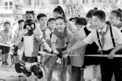湖南省永州市冷水滩区梅湾小学,孩子们在和人形机器人互动。雷中祥摄/光明图片