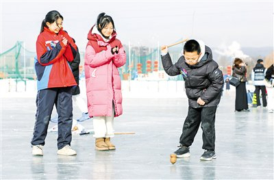 1月27日,一名青少年正在抽冰尜。当日,2025—2026呼和浩特青少年冰雪运动会在东河冰雪场启幕,吸引了来自呼和浩特市多所学校及青少年体育社会组织的400余名青少年参赛。运动会按年龄划分小学组、初中组、高中组和青少年体育社会组织组,设置冰车接力赛、射门大比拼、雪地竞速等项目,让不同年龄段的青少年都能尽情畅享冰雪运动的乐趣。本报记者  孟和朝鲁  摄