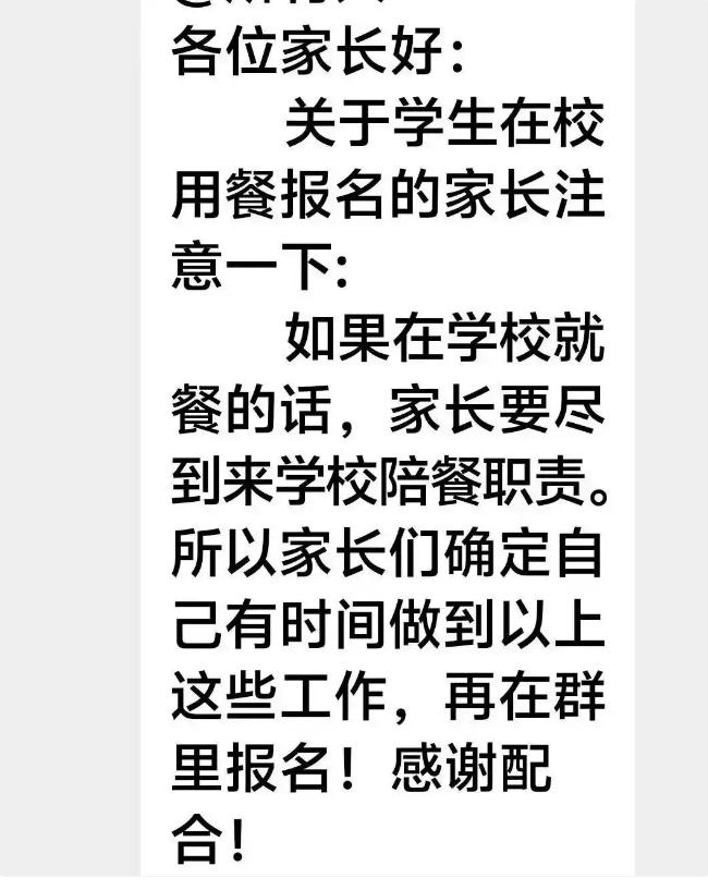 郭先生10岁的儿子,是山西运城闻喜县城西小学4年级的学生。他告诉记者,过去3年,每月缴纳200元左右,儿子就能在学校吃上午餐。可今年9月刚开学,班级群里却发出通知:“如果孩子在学校就餐,家长要尽到来校陪餐的职责,确定自己有时间能做到,才能报名在校用餐。”
