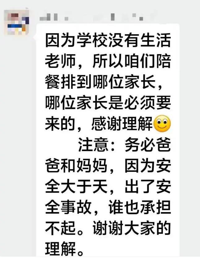 对于为何要推行“家长陪餐”,这名班主任解释称,由于学校规定,以及低年级学生使用平底餐具端餐存在安全风险,因此需要家长和老师共同陪护。“不只是家长要陪同,我们老师也要陪同,这都是为了学生安全考虑。”该班主任说。