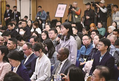 中国妇女报全媒体记者张凌漪在民生主题记者会上提问。中国妇女报全媒体记者 杨睿/摄