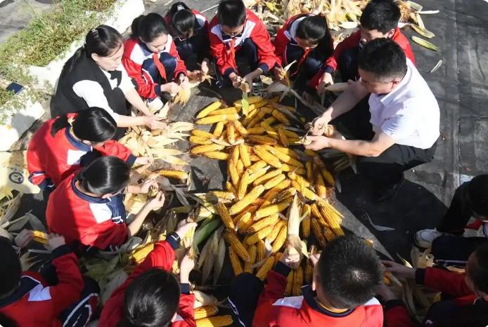 9月25日,广平县第一实验小学学生在“校园农场”收获玉米。