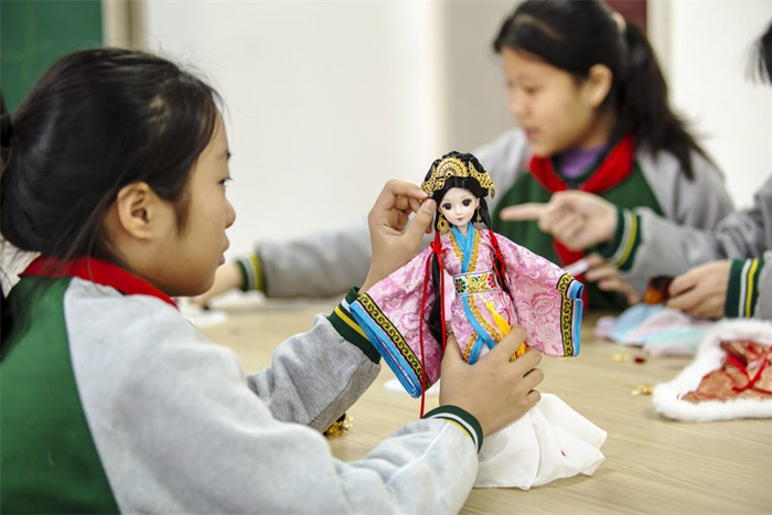 1月22日,邯郸市复兴区箭岭小学学生在制作古装娃娃。