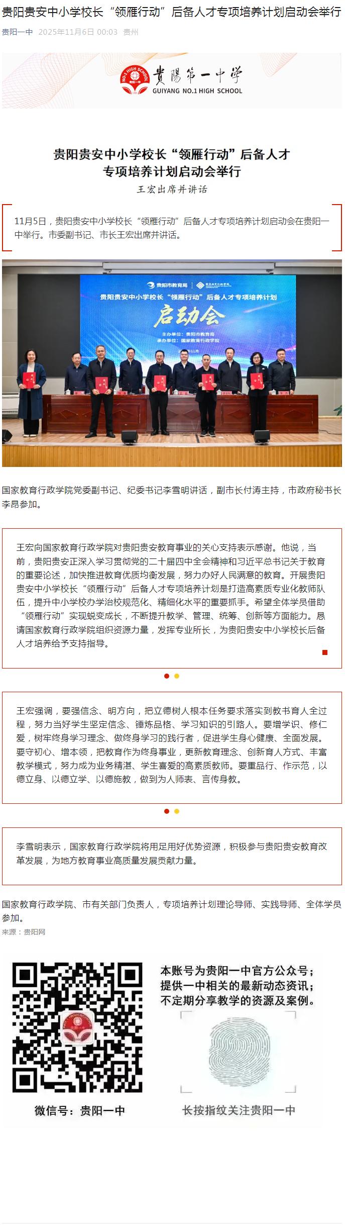 王宏向国家教育行政学院对贵阳贵安教育事业的关心支持表示感谢。他说,当前,贵阳贵安正深入学习贯彻党的二十届四中全会精神和习近平总书记关于教育的重要论述,加快推进教育优质均衡发展,努力办好人民满意的教育。开展贵阳贵安中小学校长“领雁行动”后备人才专项培养计划是打造高素质专业化教师队伍,提升中小学校办学治校规范化、精细化水平的重要抓手。希望全体学员借助“领雁行动”实现蜕变成长,不断提升教学、管理、统筹、创新等方面能力。恳请国家教育行政学院组织资源力量,发挥专业所长,为贵阳贵安中小学校长后备人才培养给予支持指导。