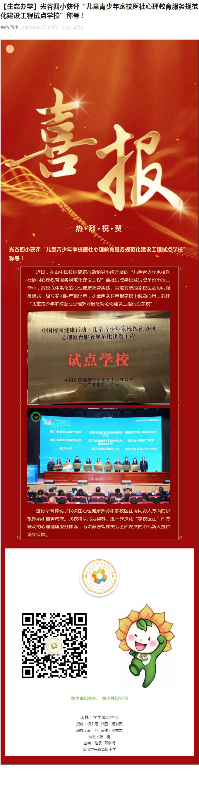 【生态办学】光谷四小获评“儿童青少年家校医社心理教育服务规范化建设工程试点学校”称号!