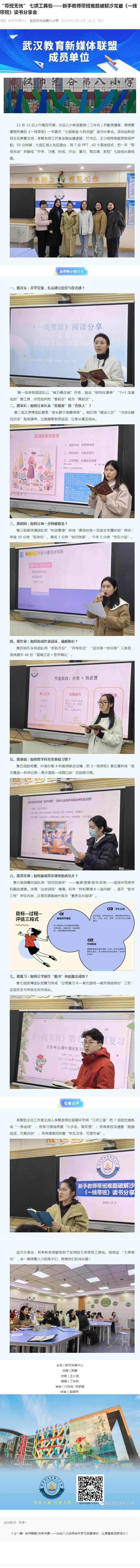 12 月 11 日上午第四节课,光谷八小新进教师(三年内)齐聚录播室,围绕管建刚所著的《一线带班》一书展开“七组联读·七科共振”读书分享会。活动由新进班主任罗蒙主持,李敏名师工作室全程坐镇答疑,付书记、王小明特级教师到场护航。50 分钟里,七组汇报人先后登台,用 7 份 PPT,42 个落地招式,把一本“带班兵法”拆解成“开学、习惯、时间、作业、复习、常态课、家校”七段成长路线图。
