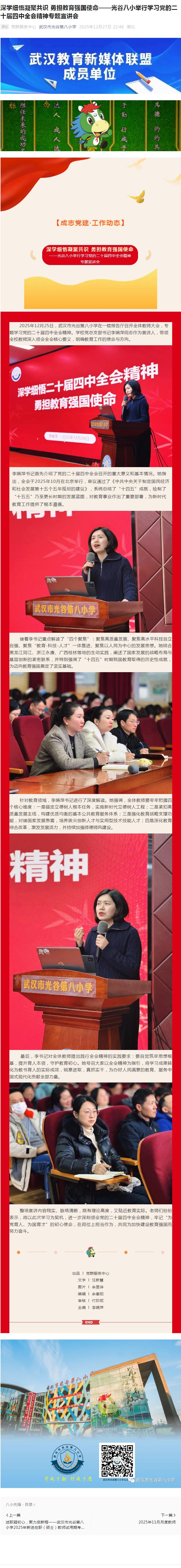 2025年12月25日,武汉市光谷第八小学在一楼报告厅召开全体教师大会,专题学习党的二十届四中全会精神。学校党总支部书记李娟萍同志作为宣讲人,带领全校教师深入领会全会核心要义,明确教育工作的使命与方向。