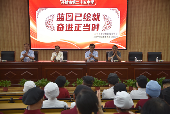 热气腾腾的饭菜、温暖贴心的服务,学校餐厅工作人员用汗水与爱心为新生军训筑起坚实”能量补给站”。2025年8月31日,开封市第二十五中学2028级新生军训餐饮保障总结表彰大会在学校阶梯教室隆重举行。大会旨在表彰在军训期间为餐饮保障工作做出突出贡献的集体和个人。校长张海英、德育副校长刘剑峰、工会主席于海涛、餐厅主管领导王永胜出席了会议,学府居餐饮公司经理张新正及餐饮公司全体员工参加了表彰大会。
