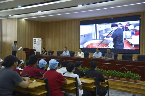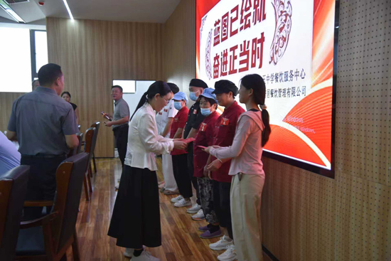 于海涛首先代表学校向所有餐饮工作人员表示衷心感谢。他表示:”‘味道很好,分量也足!’这是同学们对你们工作的最高评价。你们用营养可口的饭菜成为了同学们训练期间坚实的‘能量补给站’。”