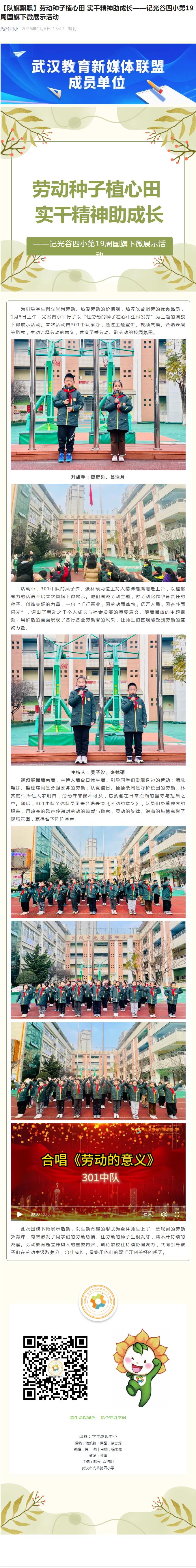 为引导学生树立崇尚劳动、热爱劳动的价值观,培养吃苦耐劳的优良品质,1月5日上午,光谷四小举行了以“让劳动的种子在心中生根发芽”为主题的国旗下微展示活动。本次活动由301中队承办,通过主题宣讲、视频展播、合唱表演等形式,生动诠释劳动的意义,营造了爱劳动、勤劳动的校园氛围。