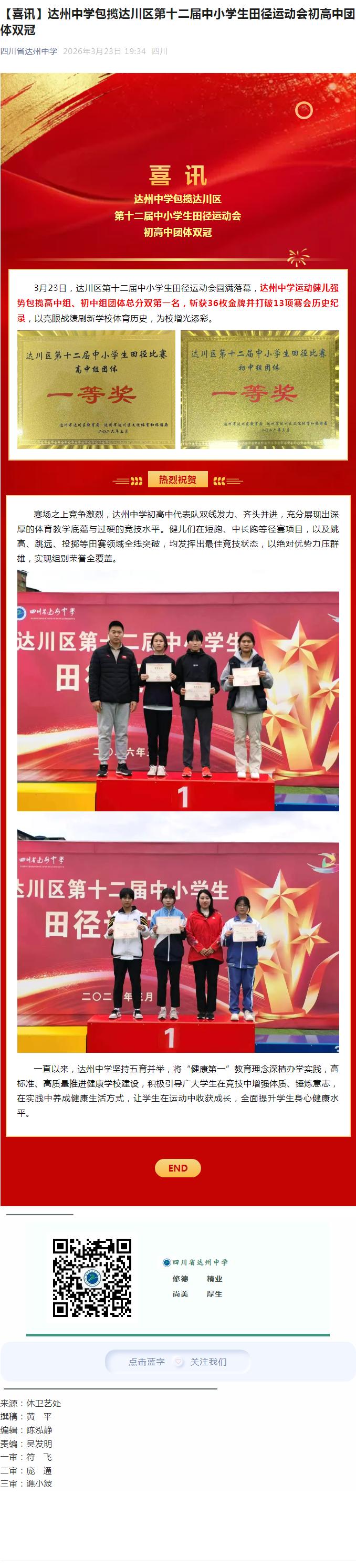 3月23日,达川区第十二届中小学生田径运动会圆满落幕,达州中学运动健儿强势包揽高中组、初中组团体总分双第一名,斩获36枚金牌并打破13项赛会历史纪录,以亮眼战绩刷新学校体育历史,为校增光添彩。