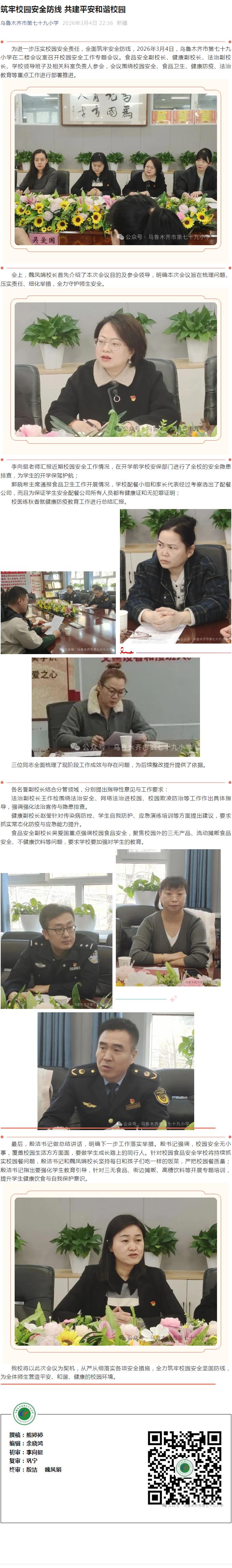 为进一步压实校园安全责任,全面筑牢安全防线,2026年3月4日,乌鲁木齐市第七十九小学在二楼会议室召开校园安全工作专题会议。食品安全副校长、健康副校长、法治副校长、学校领导班子及相关科室负责人参会,会议围绕校园安全、食品卫生、健康防疫、法治教育等重点工作进行部署推进。