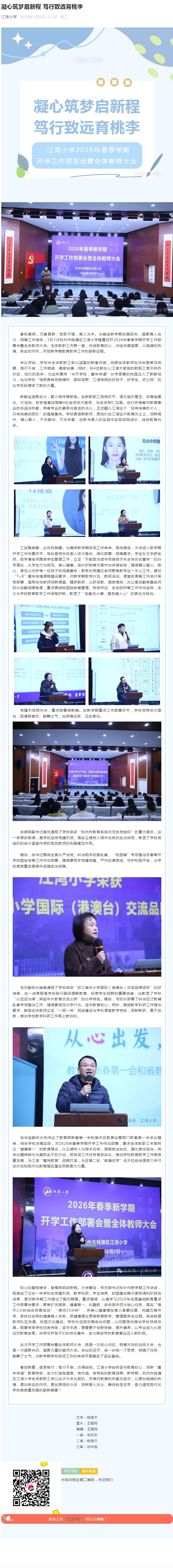 春和景明,万象更新;弦歌不辍,育人为本。为锚定新学期发展航向,凝聚育人合力,明确工作使命,3月3日杭州市钱塘区江湾小学隆重召开2026年春季学期开学工作部署会暨全体教师大会。全体教职工齐聚一堂,共话教育初心,共绘发展蓝图,以饱满的热情、务实的作风,开启新学期教育教学工作的崭新征程。