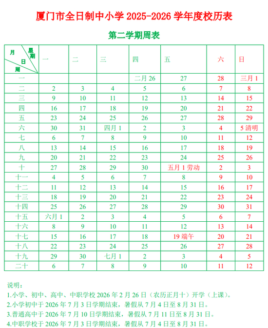 以福建厦门的校历为例,2026年春季学期2月26日正式上课,7月4日左右放暑假,总时长约20周,但减去清明、五一、端午假期,实际教学天数不到90天。